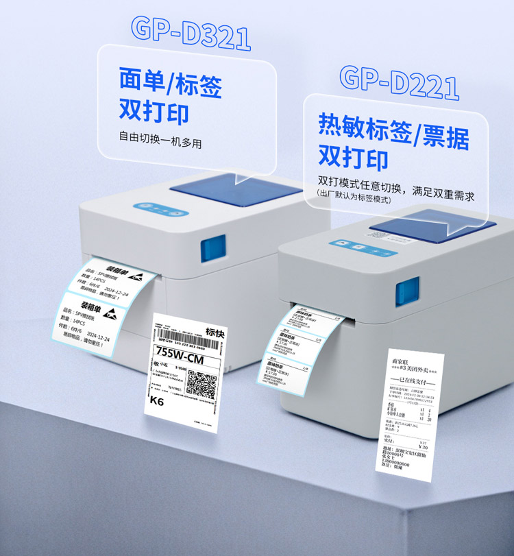 在耗材兼容性方面,GP-D221&2120D支持多种类型的标签纸,包括连续纸、间隙纸、黑标纸、卷筒纸和折叠纸等,确保用户能够根据实际需求选择合适的耗材,实现最佳的打印效果。
